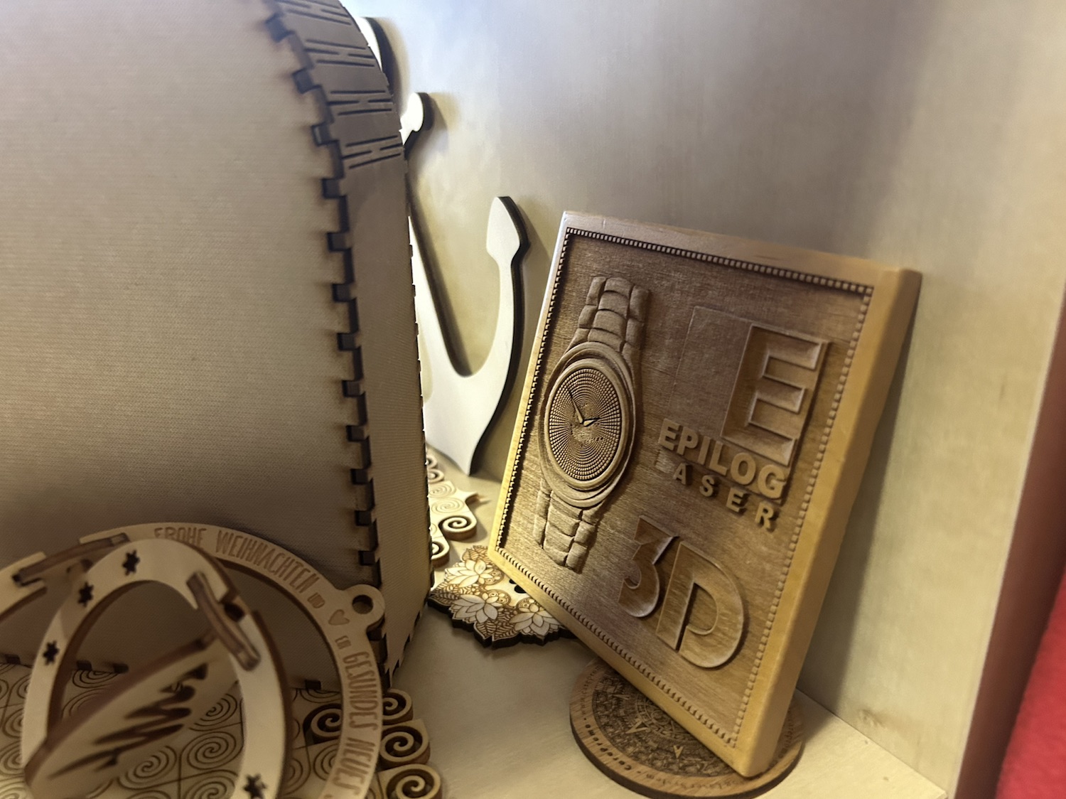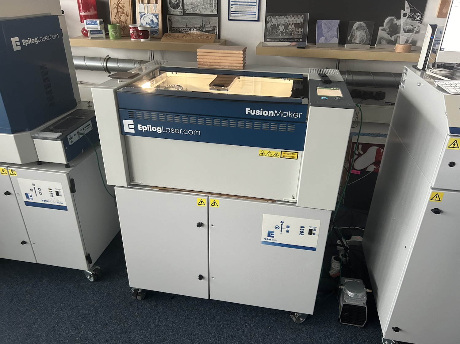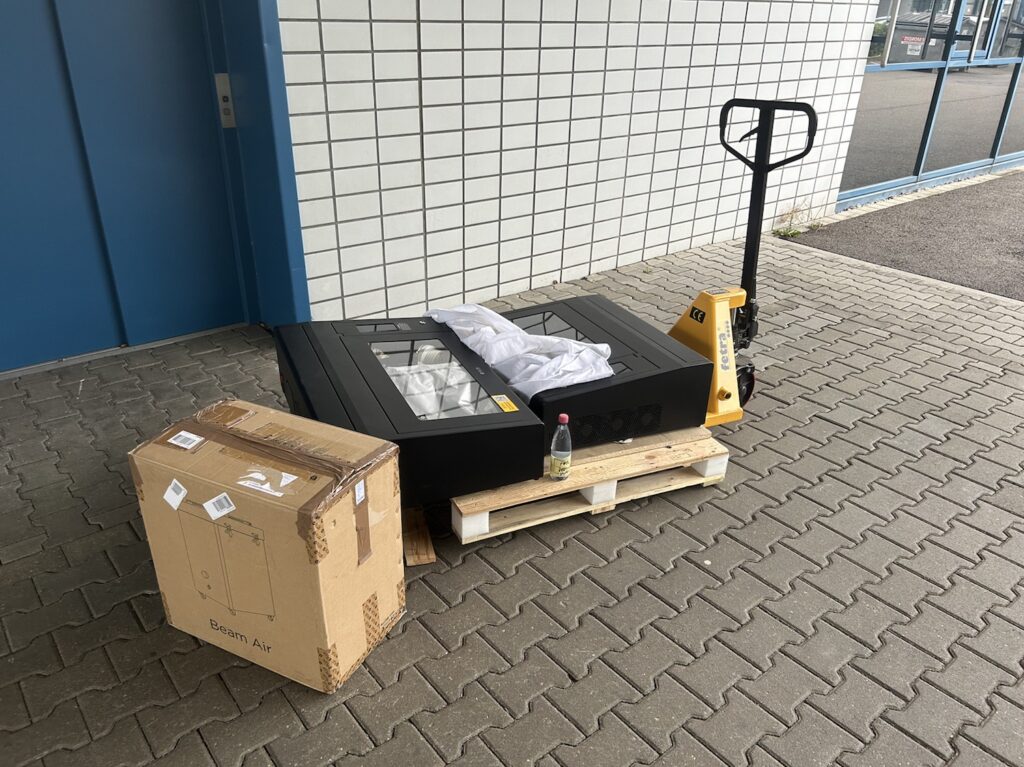Eine Übersicht über die vielen verschiedenen Spielzeuge für große Kinder, ein paar Exponate aus dem Lasercutter. Und unten unsere Abholung, ein Beambox Pro mit BeamAir Luftfilter. Jetzt noch aufbauen und einweihen!