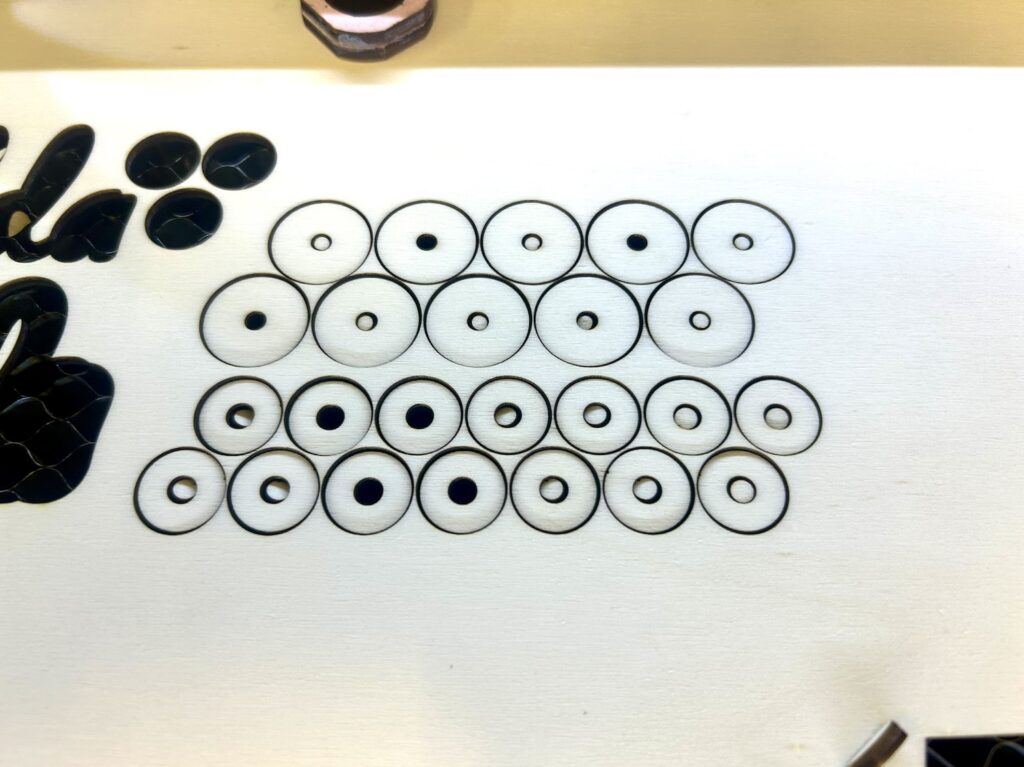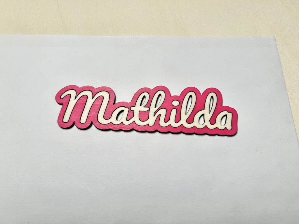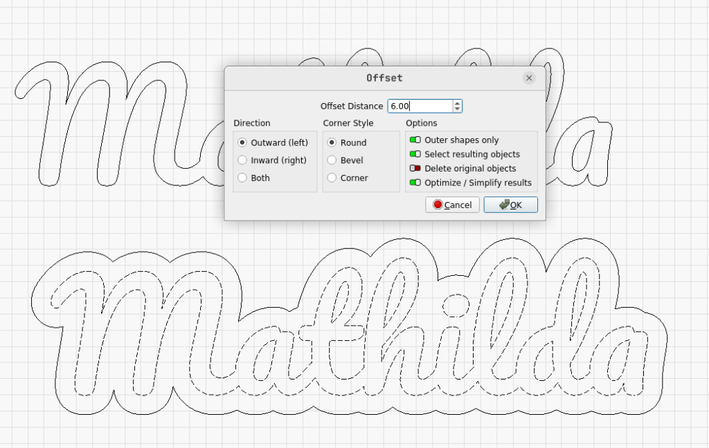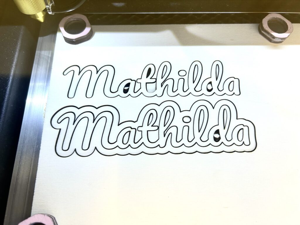 Da der Laserstrahl ja auch eine gewisse Dicke hat, schneiden wir einmal den Namen als Form aus, und dann die Umrandung getrennt erneut. In beiden Fällen korrigieren wir die Dicke des Laserstrahls, damit es dann eine möglichst gute Passung gibt.