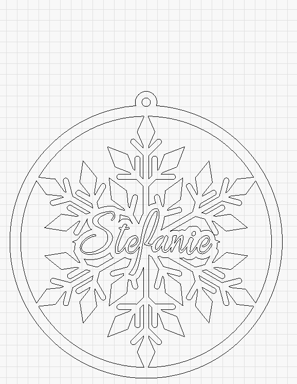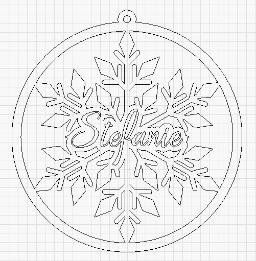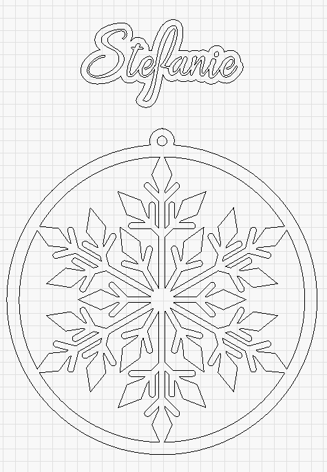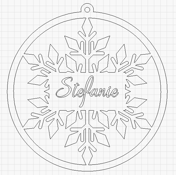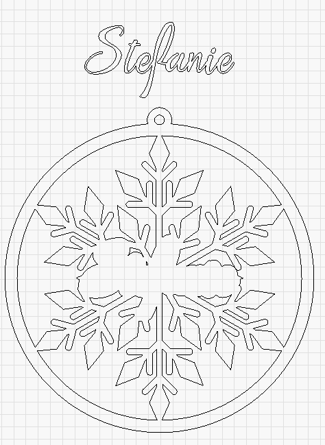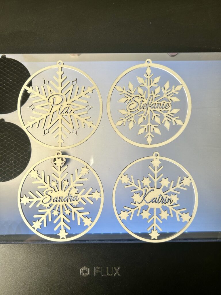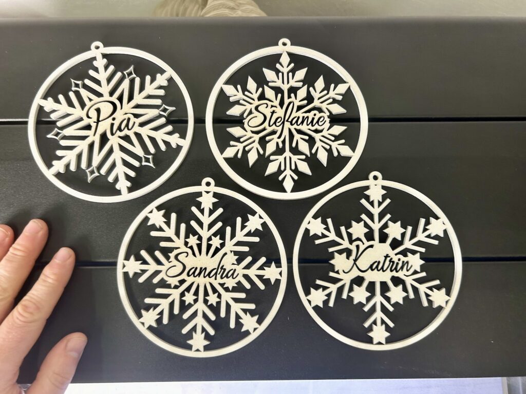Die Schrift ist mit 20-25mm Höhe hier auch eher zierlich und klein, und es bleibt mehr von der Schneeflocke erhalten. Die erste Variante ist universeller nutzbar, und kann Euch als Vorlage für das schnelle Erstellen mehrerer Schneeflocken dienen, wo ihr dann nur noch den Namen austauschen müsst.