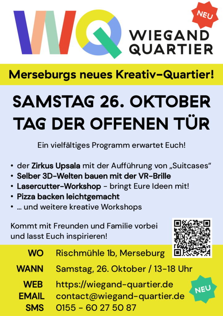 Am Samstag, dem 26. Oktober, zeigen wir von 13-18 Uhr allen Interessierten erneut den aktuellen Stand im Wiegand-Quartier. Dabei gibt es auf dem Areal ein buntes Programm mit dem Circus Upsala und erneut diversen Workshops zum Mitmachen.