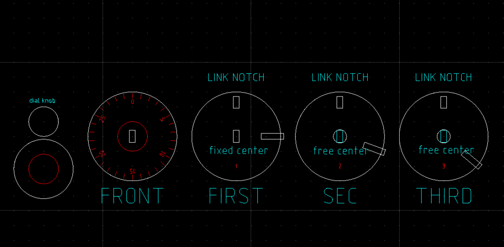Also habe ich mit der Konstruktion begonnen, und mir die Sichtscheibe, die drei Scheiben dahinter, und eine verbindene Achse überlegt. Sichtscheibe und Scheibe 1 sollen fest auf der Achse sitzen, die Scheibe 2 und Scheibe 3 hingegen sollen frei drehen können. Deutlich zu erkennen auch schon die Löcher für die Mitnehmer von Scheibe 1 auf 2, und von 2 auf 3. Und auch die Aussparungen sind bereits (an willkürlicher Stelle) vorhanden.