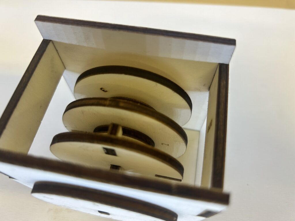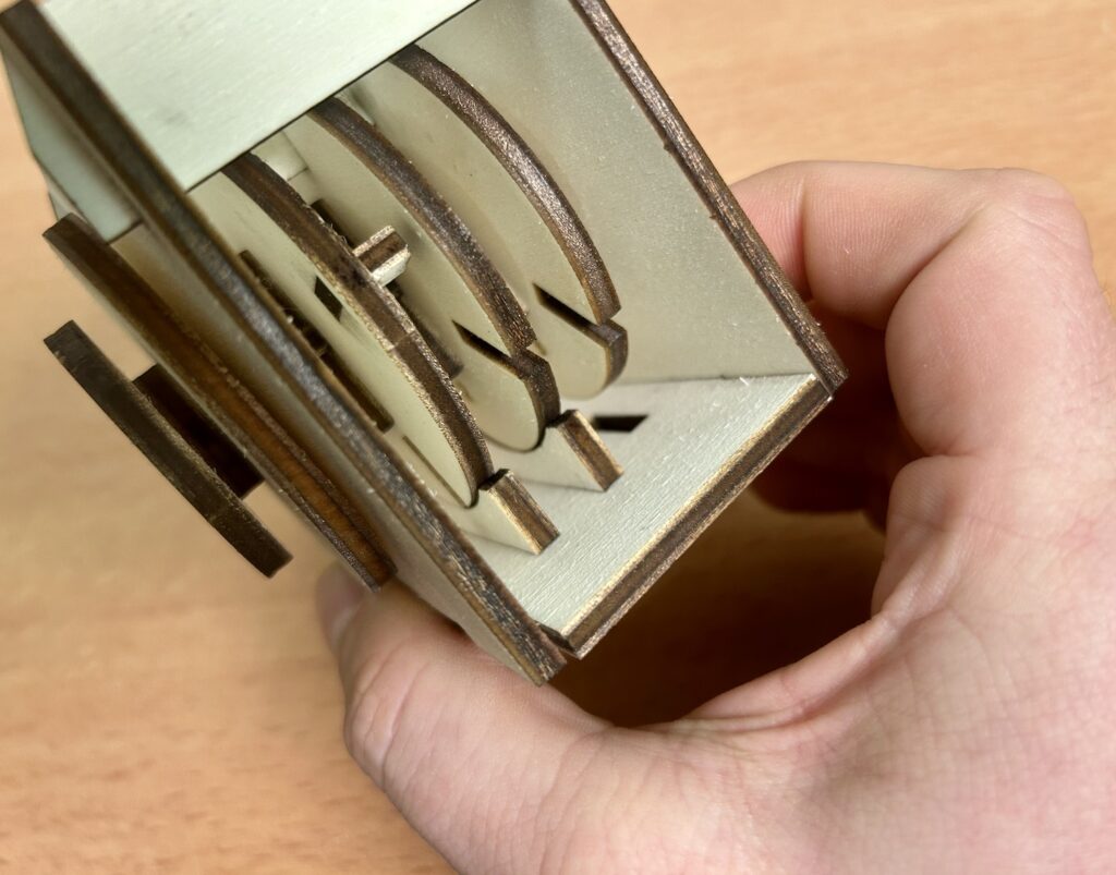 Sobald der zentrale Mechanismus sauber funktioniert, kann rechts daneben noch der Schließmechanismus angebaut werden, der nur bei korrekter Anordnung der Scheibenposition dann die Öffnung freigibt. Und die Kombination dann konfigurierbar machen wäre auch noch ein nettes Feature.