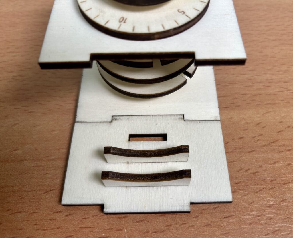 Die Mitnehmer (kleine rechteckige Teile mit 1, 2 und 3 beschriftet) werden jeweils in die Scheiben mit gleicher Nummer eingeleimt, und dienen dazu ab einer gewissen Position die jeweils nachfolgende Scheibe auch mitzunehmen.