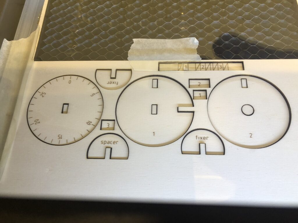 Als erstes habe ich die Achse gelasert (im folgenden Bild ganz oben und mit 1 2 und 3 beschriftet), und die ersten beiden Drehräder, die per halbrundem spacer/fixer auf der Achse positioniert werden.