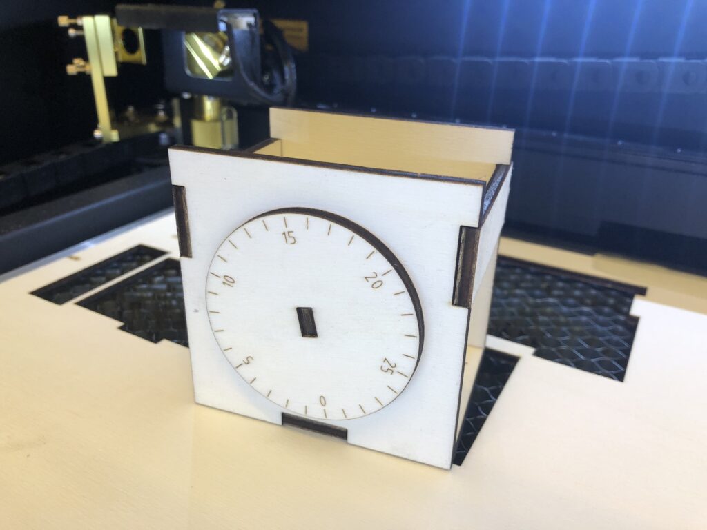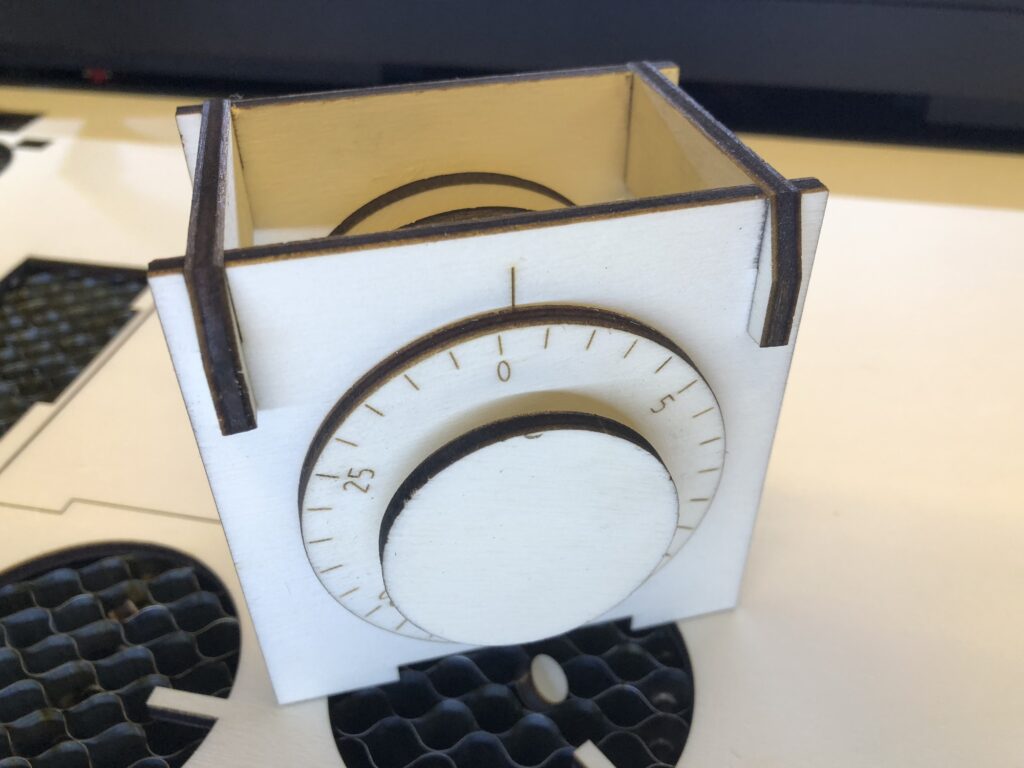 Änderung: In der zweiten Version habe ich daher im Boden etwas ähnliches eingebaut, dabei oben das Gehäuse noch anders zusammensteckbar gestaltet, und den Dreh-Knopf vorne etwas dreidimensionaler gestaltet. 🙂