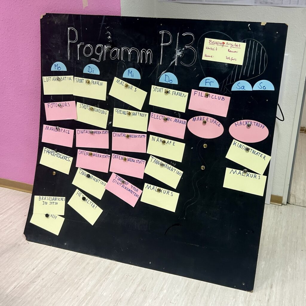 Was ich auch total beeindruckend finde, ist dass es in der Passage13 jeden Wochentag verschiedene Treffen und Initiativen gibt. Von Offener Werkstatt über Malkurs, Digitale Werkstatt und Filmclub bis zum Hackertreff am Wochenende. So wünsche ich mir das für das Wiegand Quartier in Merseburg auch!